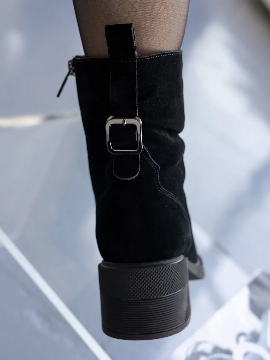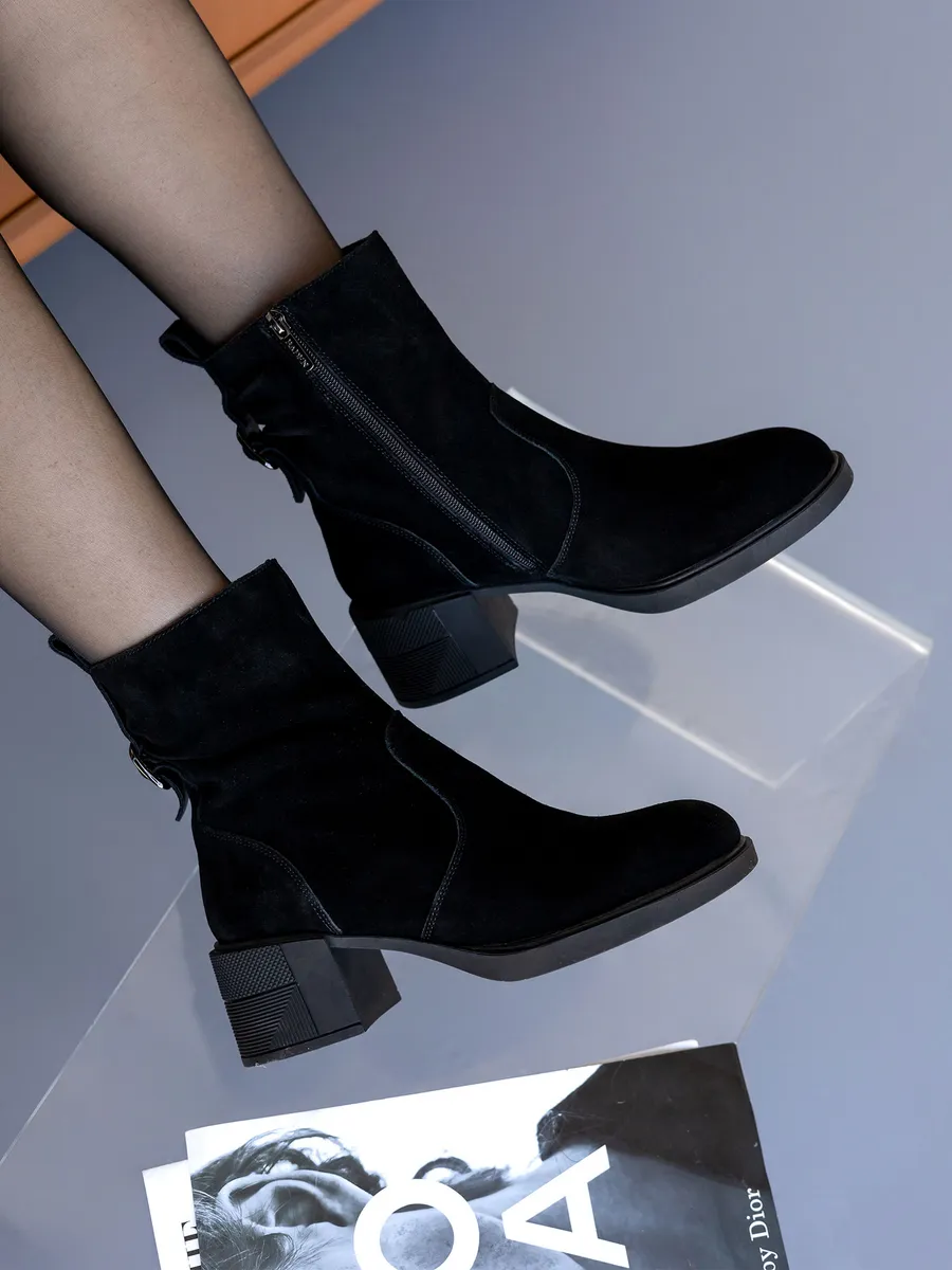Ботильоны на каблуке выполнены из натуральной замши и дополнены вставками, придающими модели современный и стильный вид. Каблук средней высоты обеспечивает женственность и элегантность, а удобная колодка позволяет носить обувь в течение всего дня без ощущения усталости. Черные ботильоны прекрасно сочетаются с различными нарядами, будь то офисные образы или более повседневные варианты. Это универсальная зимняя обувь, которая гармонично впишется в любой гардероб.