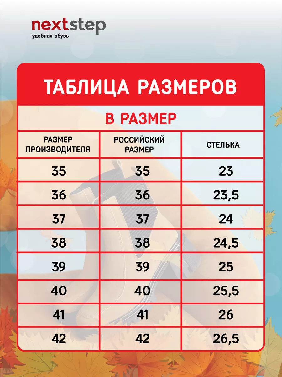 Ботинки идут размер в размер, длина стельки в 38 размере 24,5 см, длина стельки увеличивается на 0,5 см с увеличением размера. Модель хорошо подойдёт на среднюю и полную стопу. Кожаные ботинки на массивной подошве из ПУ (Полиуретан). Толщина подошвы выше 1см, чтобы стопа не ощущала дискомфорт от неровности поверхностей. Кожаные ботинки эластичные, прочные, долговечные, они хорошо пропускают воздух и не позволяют стопе потеть, создавая комфортные условия на весь день. Ботинки застёгиваются на молнию и обеспечивают идеальную посадку, которую легко отрегулировать с помощью шнуровки. Материал подкладки - натуральная байка. Подкладка из натуральной байки обеспечивает дополнительный комфорт Вашим ногам, ощущение мягкости. Материал дышит и сохраняет тепло.