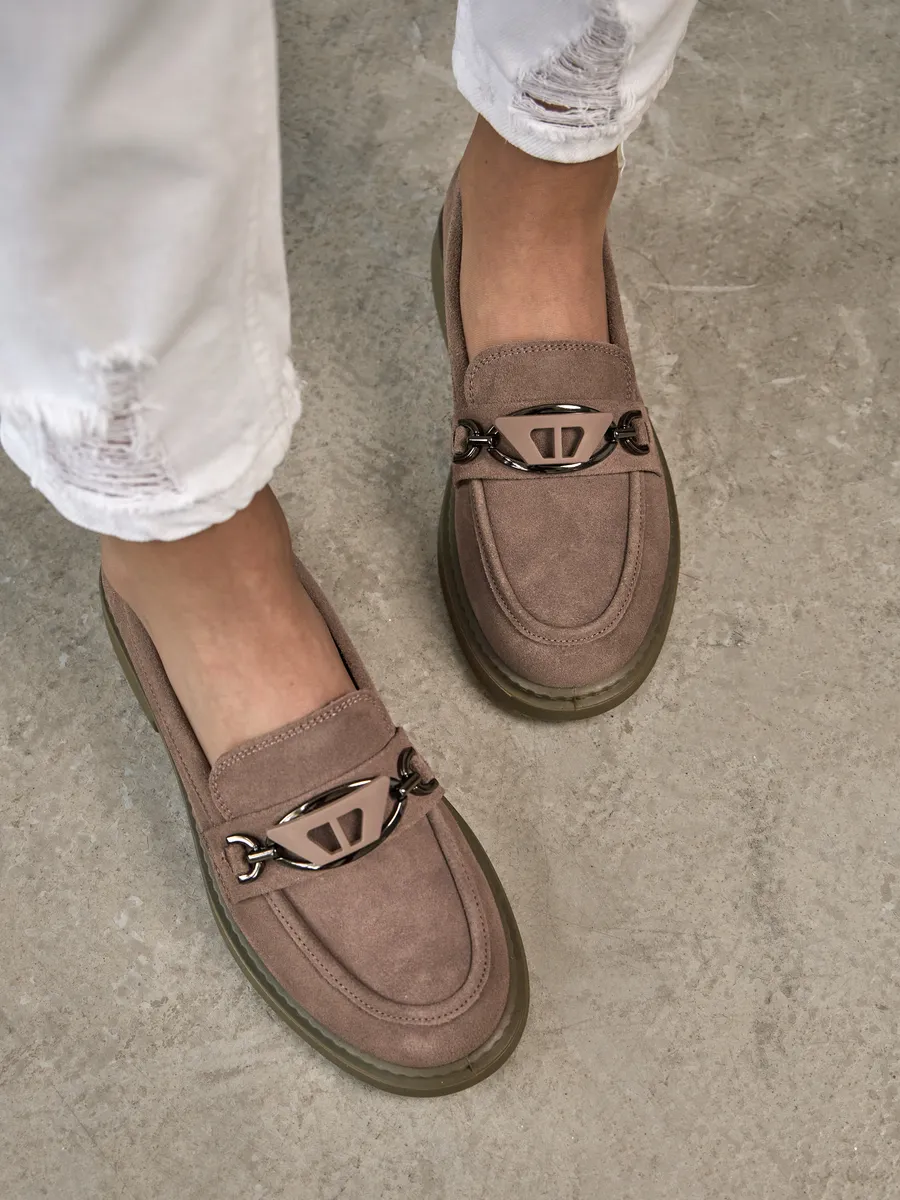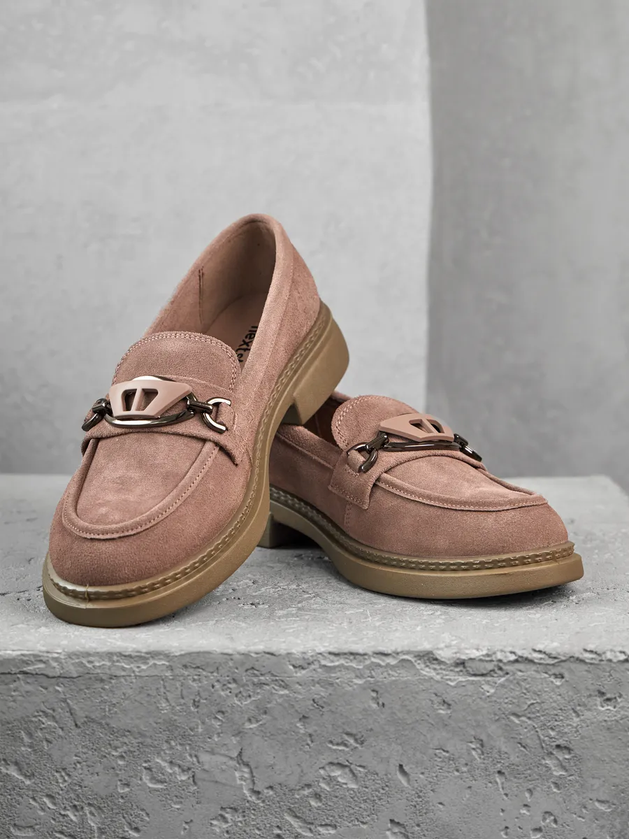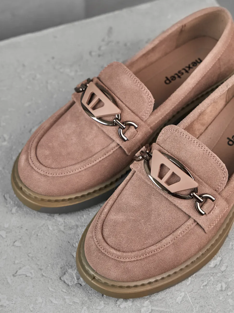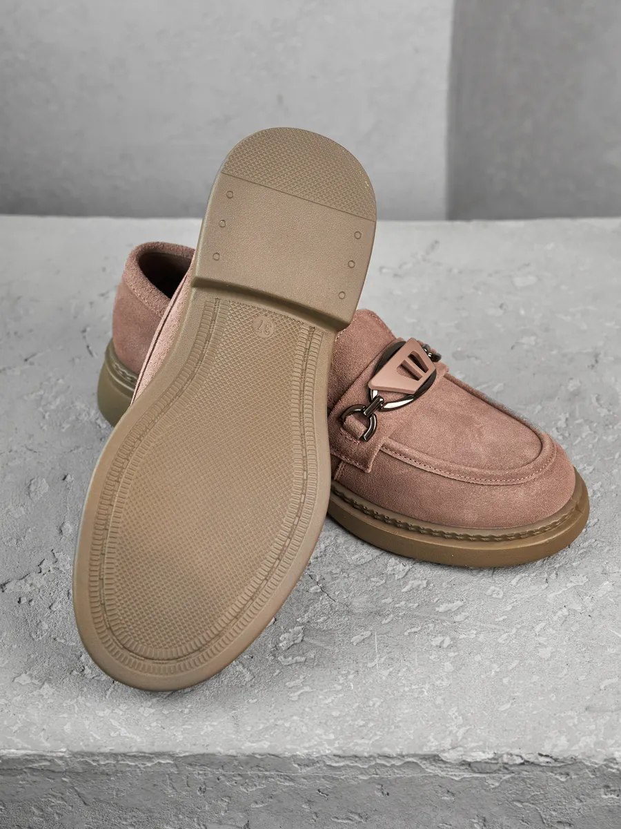 Наши лоферы выполнены из высококачественной натуральной замши, что обеспечивает долговечность и стильный внешний вид. Модная и классическая модель представлена в интересном розовом цвете с серым отливом на низком каблуке и платформе. Стелька с ортопедическим эффектом и удобная подошва гарантируют максимальный комфорт при ходьбе, даже на протяжении длительного времени.