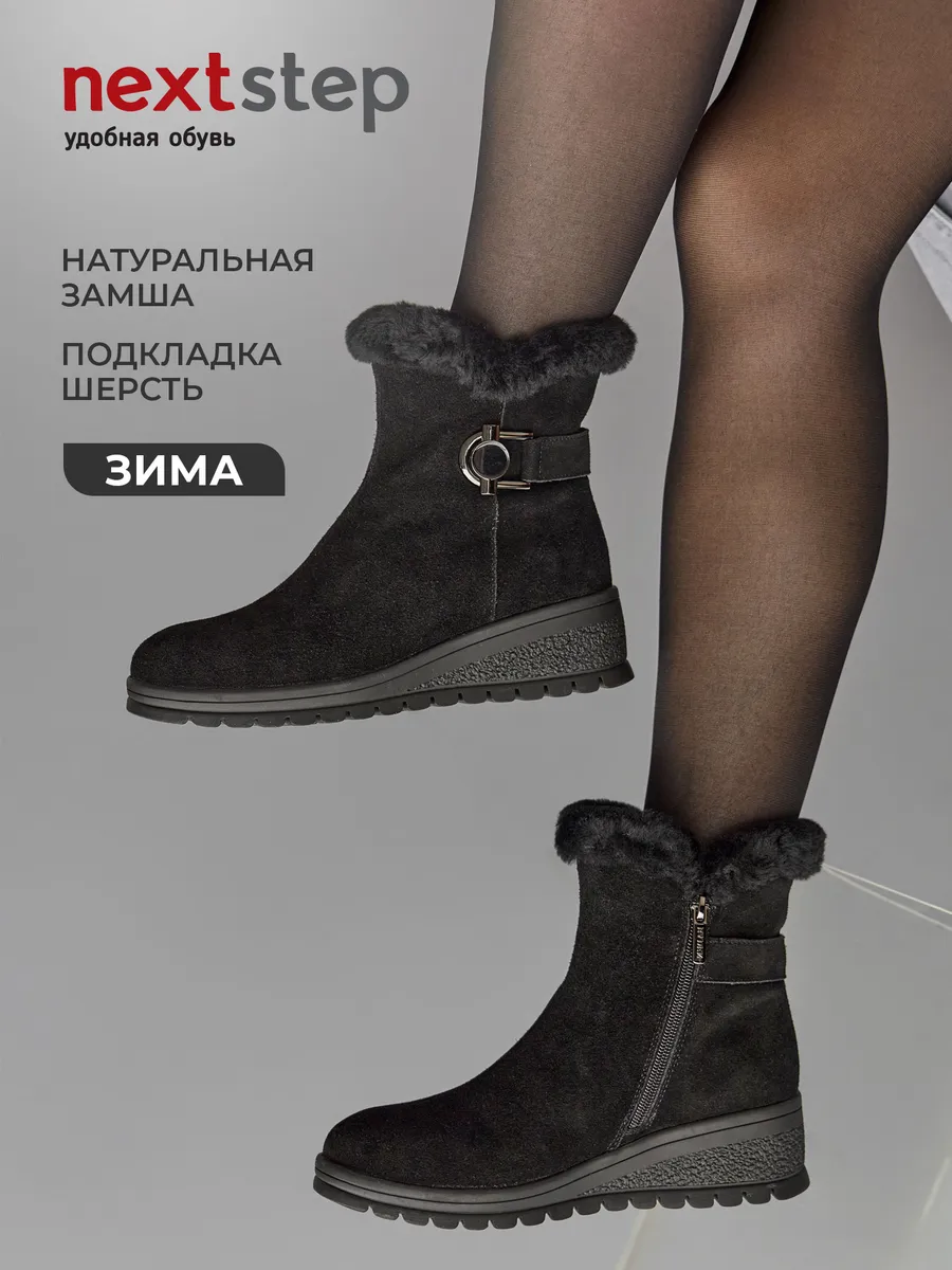 Полусапожки выполнены из высококачественной натуральной замши, что гарантирует их долговечность и устойчивость к износу. Мягкая меховая опушка не только придаёт обуви стильный вид, но и добавляет дополнительную теплоизоляцию, создавая комфорт даже при низких температурах. Эти зимние короткие сапоги идеально подойдут как для повседневного использования, так и для работы в офисе или вечерних выходов. Благодаря универсальному темному цвету, они легко сочетаются с любым нарядом, делая ваш образ завершённым и элегантным.