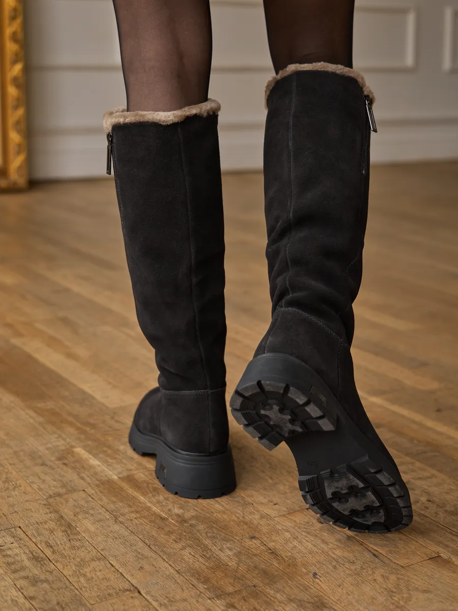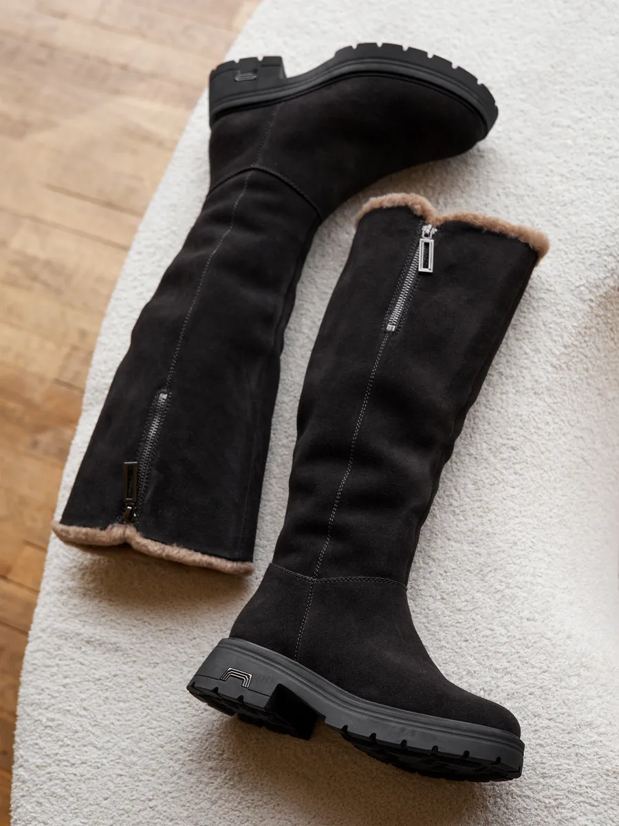 Сапоги выполненные из высококачественной натуральной замши обеспечивают долговечность и комфорт. Длинные сапоги с функциональной молнией на верхней части голенища позволяют увеличить обхват примерно на 4,5 см. Подкладка и съемная стелька из натуральной шерсти гарантирует тепло ваших ног в сильные морозы. Тракторная подошва позволит чувствовать себя устойчиво на скользкой поверхности.